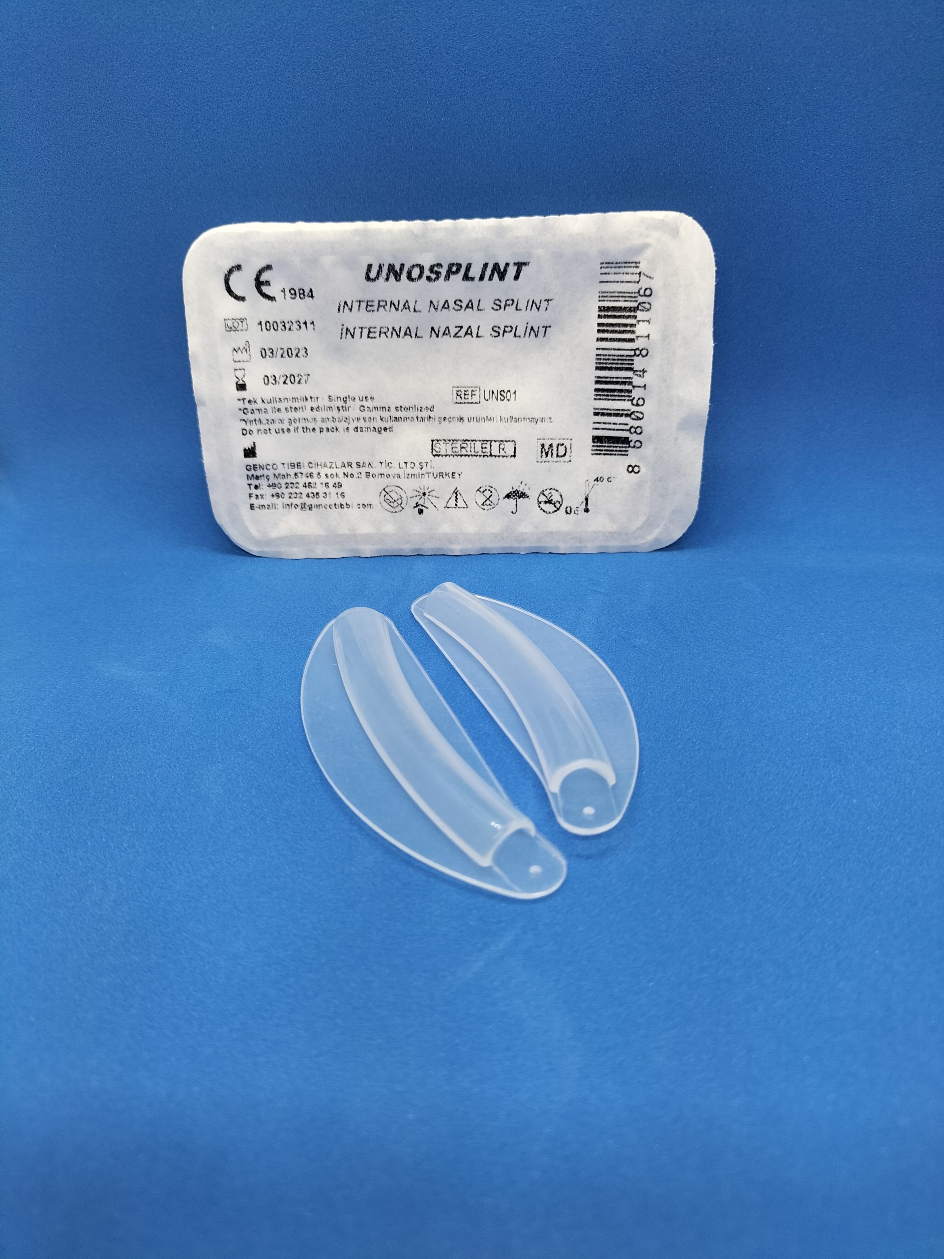 The Unosplint Internal Nasal Splint is indicated for nasal surgeries in general (Septoplasties, sinusectomies, rhinoplasties, tubinectomies, epistaxis surgeries and pituitary surgeries), and has to be positioned near the nasal septum.